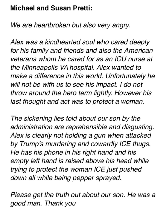 “We are devastated and also very angry,” the parents said. “Alex was a kind soul who cared deeply for his family, friends, and the veterans he served as an ICU nurse at the Minneapolis VA hospital. He wanted to make a positive impact in the world, but sadly, he won’t be here to see it.”