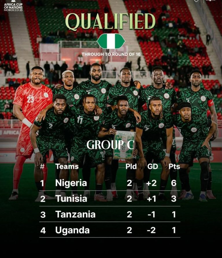 Nigeria’s Super Eagles secured qualification for the Round of 16 at the 2025 Africa Cup of Nations with a dramatic 3–2 victory over Tunisia in an entertaining Group C encounter at Fez Stadium on Saturday night. The win took Nigeria to six points after two matches, placing them firmly at the top of the group ahead of Tunisia on three points, while Tanzania and Uganda trail with one point apiece going into the final round of fixtures on Tuesday.